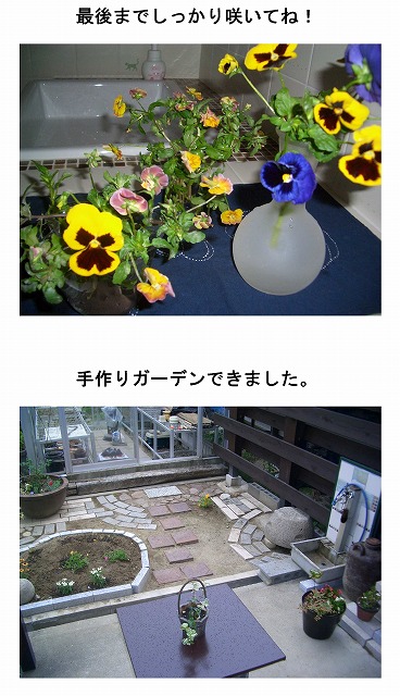 パンジーの植え替えをしました。 まだ咲いている花は花瓶に挿しました。 花茎をすべて切り取られた株は花壇へ・・・